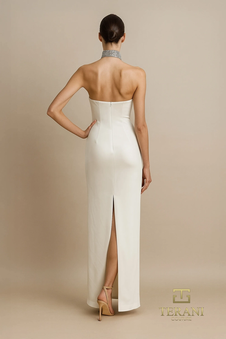 Step into modern sophistication with the Terani Couture 261E6119 evening gown, a striking design that radiates sleek elegance. Crafted from smooth scuba fabric, this strapless sheath silhouette delivers a flawless fit while maintaining clean, contemporary lines. The gown features a daring straight-across neckline and a dramatic crystal-embellished strip that cascades down the center, elongating the figure with eye-catching brilliance. A bold front slit adds movement and allure, while the 46-inch floor-length hemline ensures timeless evening glamour. Complete with a secure center-back zipper and hook-and-eye closure, this gown is both comfortable and captivating. Available in Royal, Red, and Ivory, it is the perfect choice for galas, formal receptions, or red-carpet events where making a statement is essential.
