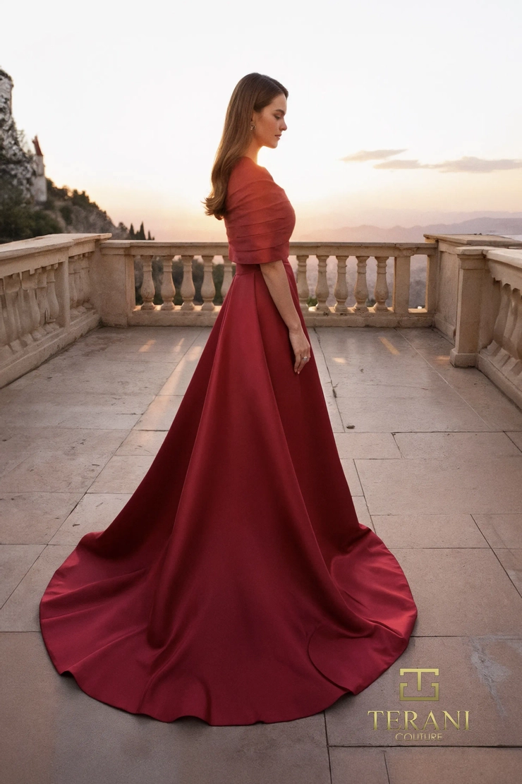 Step into timeless elegance with the Terani Couture 261M6415 mother-of-the-bride gown. Crafted from luxurious matte satin, this A-line silhouette flows with grace while offering a universally flattering fit. The straight neckline frames the shoulders beautifully, while the coordinating shawl adds versatility and sophistication, perfect for both ceremony and reception. Designed with a secure zipper and hook-and-eye closure at the center back, this gown ensures a seamless fit and effortless wear. Measuring 46 inches from waist to hem, the floor-length skirt moves with fluid ease, creating a refined and graceful presence. Available in wine, emerald, and fuchsia, this gown is the epitome of modern sophistication, ideal for mothers of the bride who seek both comfort and high-fashion appeal.