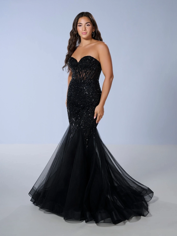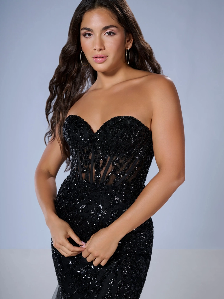 This beautiful mermaid gown is made out of beaded applique with soft tulle and a sweetheart strapless neckline.