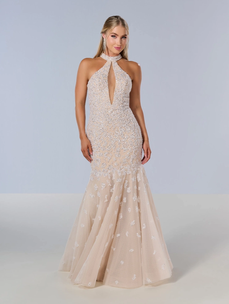 A mermaid base gown made out of beaded tulle fabric with a halter neckline.
