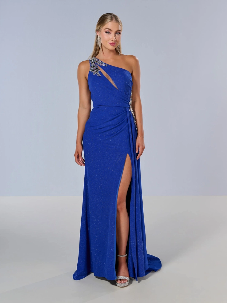 A trumpet fitted gown made out of spandex material with a one shoulder top.