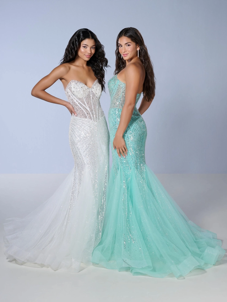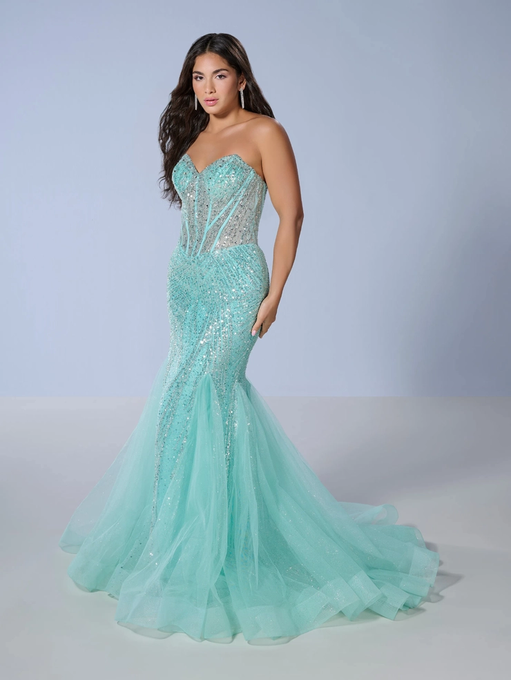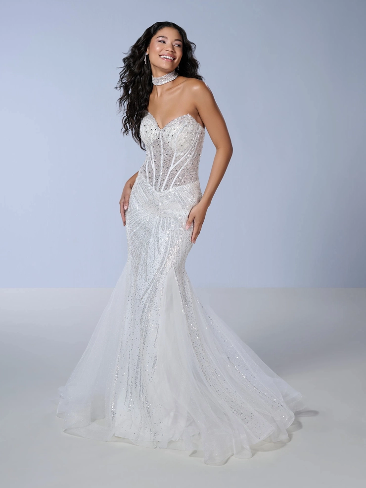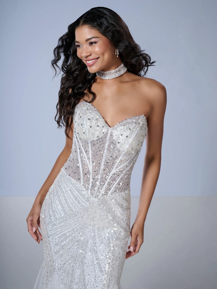 This stunning strapless mermaid gown captivates with its intricate beaded tulle fabric and sleek, form-fitting silhouette. An addition to this beautiful design is a beaded choker.