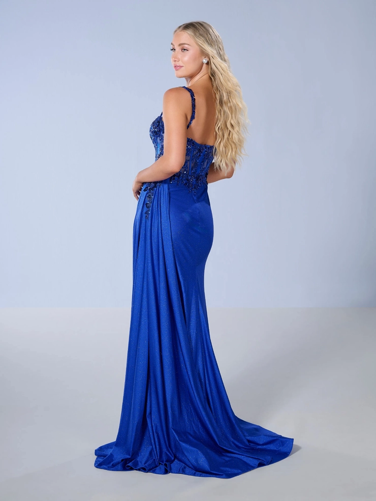 This flawless fit and flare gown is made out of floral beaded appliqued with glitter jersey material.