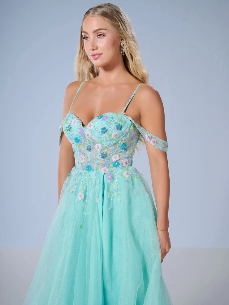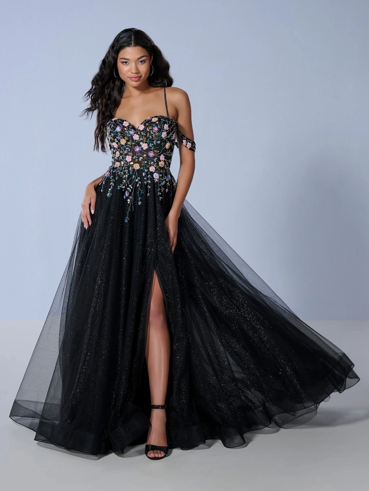 A flawless A-line fitted gown, made out of midnight garden beaded applique sparkly fabric with a sweetheart neckline. Gown also comes with detachable swag sleeves.