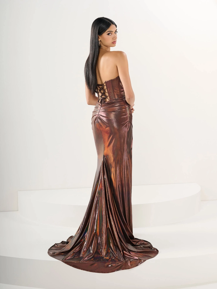 This mesmerizing gown is crafted from lustrous shimmer jersey in a deep chocolate hue, catching the light with every movement. The sweetheart neckline is enhanced by artful pleating that crisscrosses the bust, adding dimension and elegance. The bodice features a sheer illusion panel at the waist with intricate corset-style boning details, creating a flattering and structured silhouette. The skirt is gathered dramatically at one hip, accentuating curves and leading into a daring thigh-high slit for a sultry, red carpet-ready look. The back of the gown reveals a fully open design with a lace-up corset closure, providing both visual appeal and adjustable comfort. The shimmering fabric drapes smoothly over the hips and flares into a sweeping train, completing the look with dramatic flair. Gentle ruching around the lower back adds an extra touch of contouring and elegance to the flowing mermaid silhouette.