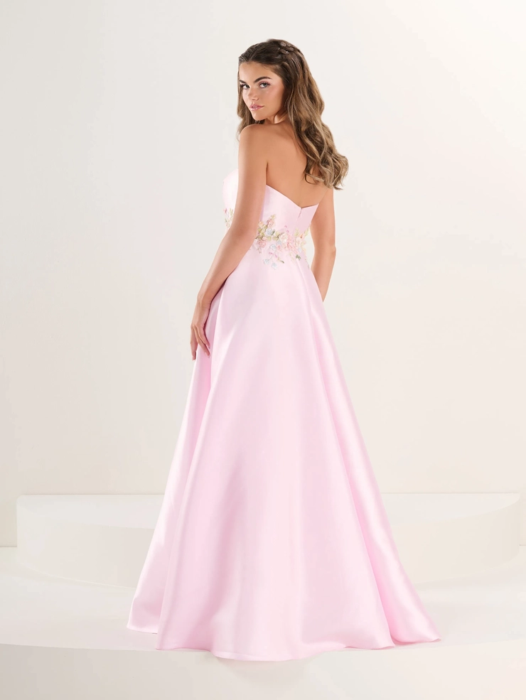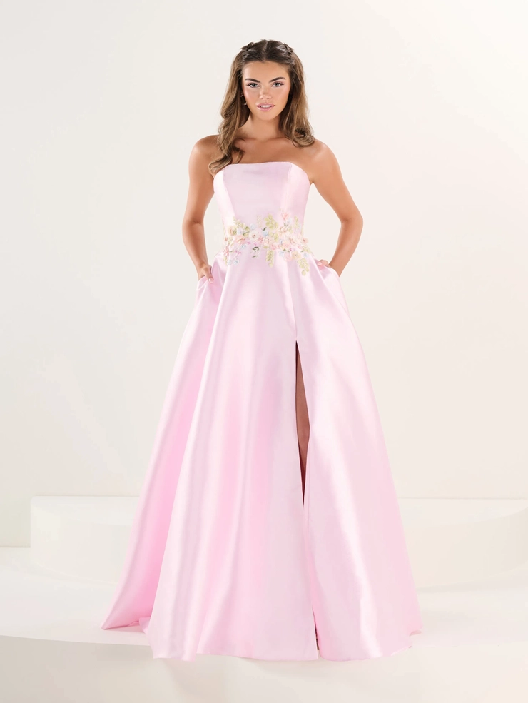 This strapless mikado ballgown features floral embellishment at the waist and the skirt has a side split